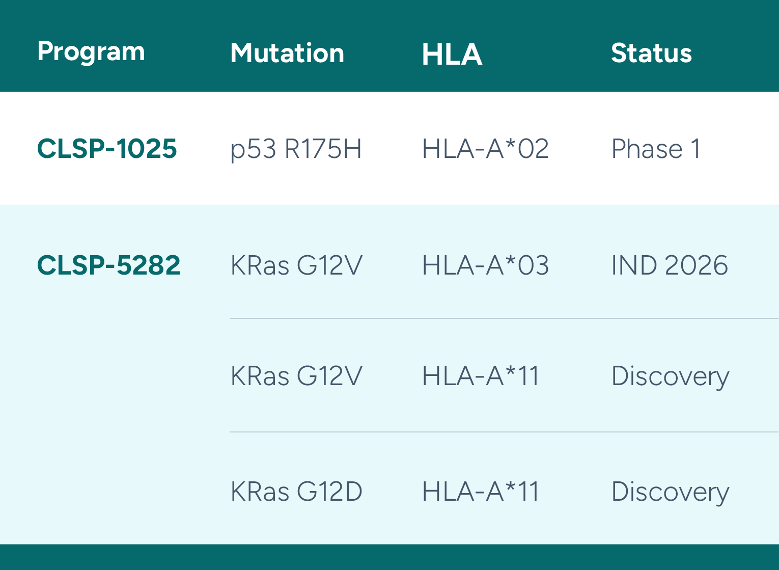 By leveraging this mechanism, Clasp can access the vast majority of cancer-driving proteins that exist only inside the cell and are invisible to traditional antibody-like drugs. And because these mutant peptide-HLA complexes are found only on cancer cells, Clasp’s TCEs are designed to attack with precision, sparing normal tissue and minimizing the risk of toxicity.